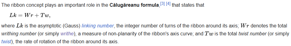 When writhe is introduced (in a quantized way?) into an otherwise ‘unknotted’ topology, the resulting structure has a low-energy state in which it folds onto itself in a double loop (as well as it can, there is always a single crossover in projection). The choice of twist direction applied to the ‘belt which is not a belt’ yields either left or right handed versions, of equal and opposite writhe, but with a similar degree of ‘tangledness’. This mirror image provides a mechanism for the distinction between matter and antimatter using local topology. The asymmetry of observed handedness is akin to snail shells - every now and again you’ll find one with the opposite handedness but there tends to be a bias. (More to be said here regarding the neutron and handedness of beta decay)