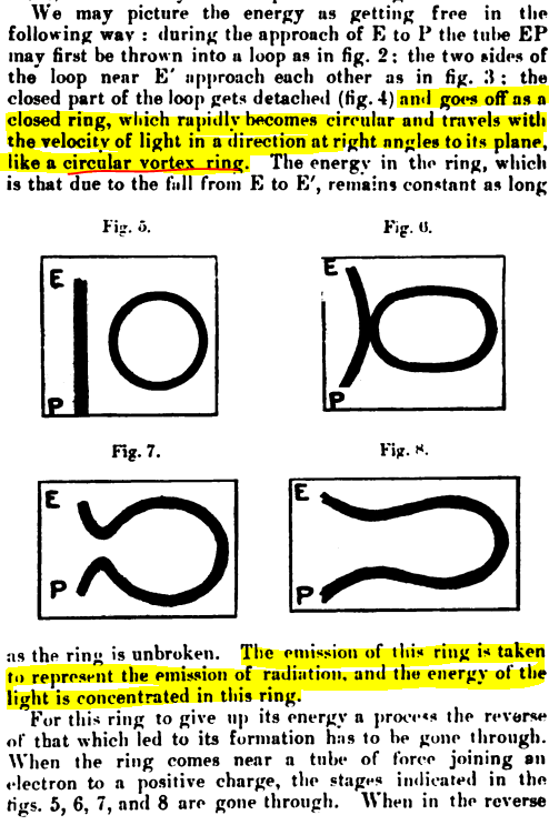 Accounting for polarization raises a few possible options, and questions about the propagation behavior remain. If J.J Thompson’s view is taken, it seems that photons might propagate ‘edge on’ like a frisbee within the plane of the ring, rather unlike a smoke ring, which travels normal to the plane of the ring while poloidally rotating. In this case, perhaps the electric oscillation of each photon would be within the plane of the ring itself (or normal to it as Thompson suggests in his 1925 paper), and the cases of linear, circular, and elliptical polarization relate back to the relative rotation of the ring as it travels like a frisbee.
