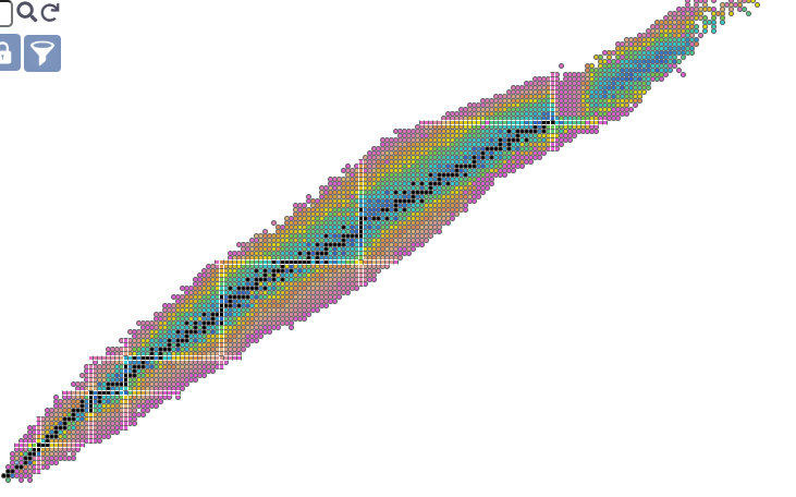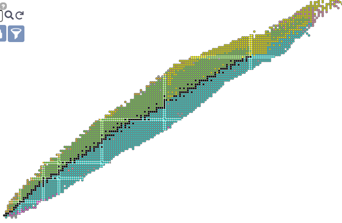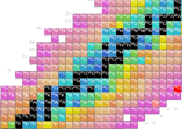 Apologies to the colorblind, but notice the transition from blueish (kinda stablish) radioisotopes to orange-to-pink (very unstable) radioisotopes. It’s more clear on the proton-rich side of the staircase (above), but someone somewhat similar seems to occur on the neutron rich side too (below), with some additional complexity. That’s kinda weird - what’s that about? It doesn’t really kick off until after Argon (abundance be damned, Ar38 looks ‘centered’, and is surrounded by two cursed neutron numbers so it’s interesting)