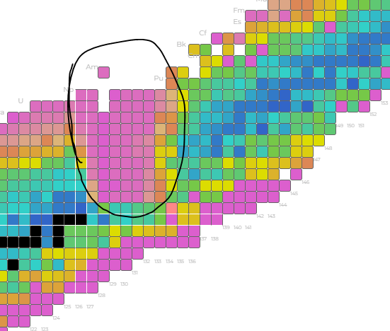 Stable (eternal unless modified?) isotopes remain black, but now the unstable ones have a color corresponding to their half life. The white bars are ‘magic number’ related (a cope if ever there was one). Less commented on is the observation of ‘cursed’ numbers, for which nothing stable exists. Technetium and Promethium are the primary cursed elements, along with neutron numbers 19, 21, 35, 39, 61, 71, 89, 115, and 123.